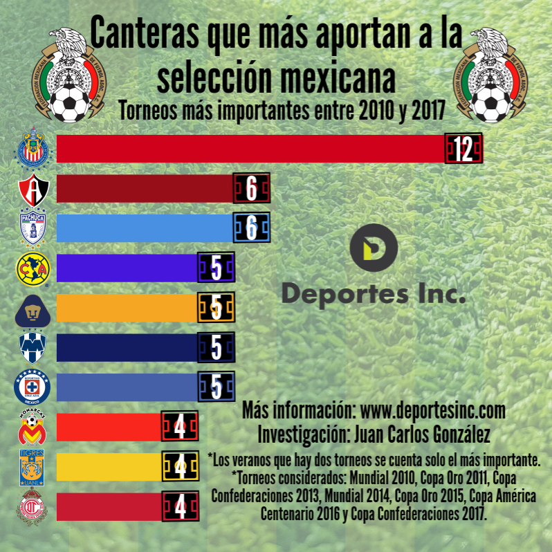 Estimado lector: ¿alguna vez se ha preguntado cuál es la cuna del talento futbolístico que existe en nuestro país? Por ello, en Deportes Inc., nos dimos a la tarea de realizar un censo entre los 135 convocados a la selección mexicana para partidos oficiales en el período comprendido del 2010 a 2017 hasta la Copa de Oro 2017.