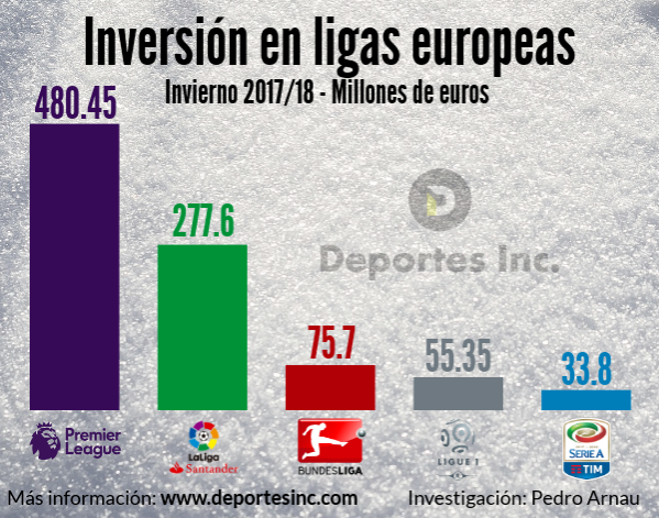 La diferencia entre la Premier league y el resto de las ligas europeas no tiene comparativo, los 480.45 millones € invertidos por los equipos ingleses superan el total de las ligas de España, Alemania, Francia e Italia juntas.