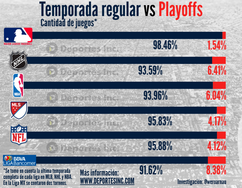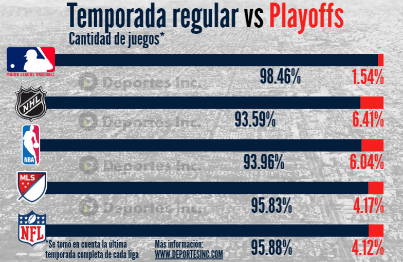 Con estos números podemos ver que es el hockey de la NHL el que tiene la postemporada más larga en relación a su temporada regular y el beisbol de la MLB en el otro extremo.