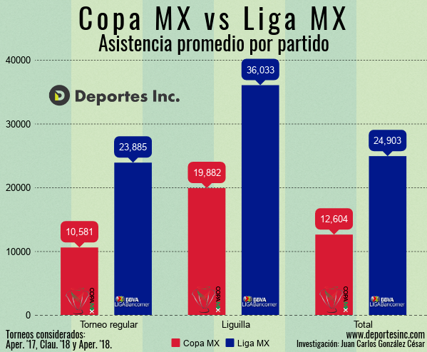 - La asistencia promedio en Copa MX fue de 12,604 aficionados por juego, por su parte, la Liga los superó casi en el doble, exactamente en un 97.58% con 24,903 aficionados por encuentro.