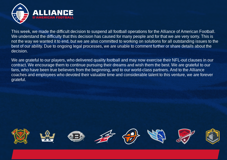 Oficialmente la AAF no ha avisado que no volverán a retomar la liga, pero se ve poco probable, además, para 2020 ya se confirmó la creación de una nueva XFL, una liga que existió por un año en 2001, y que buscará acomodarse como un producto alternativo de futbol americano.