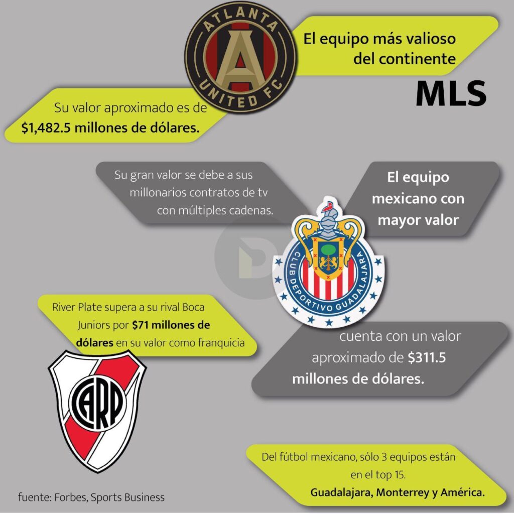 El gran negocio del Guadalajara, ha sido un éxito gracias a que vendieron sus derechos de televisión. Tanto en México, como en Estados Unidos, hay varias cadenas que transmiten a las Chivas. Por otro lado, el equipo más ganador de México, se queda atrás en la lista; el Club América tiene un valor de apenas 200 millones de dólares.