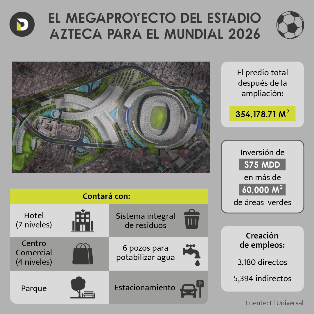 El Mundial 2026, organizado entre México, Estados Unidos y Canadá, se acerca y ya han comenzado los planes de infraestructura. El dos veces mundialista Estadio Azteca es un ícono del futbol mexicano. En consecuencia, se planea una nueva remodelación de cara al próximo Mundial. El proyecto Conjunto Estadio Azteca planea añadir un centro comercial, un hotel e importantes áreas verdes al predio actual. El ambicioso plan representaría un atractivo arquitectónico a nivel nacional e internacional.