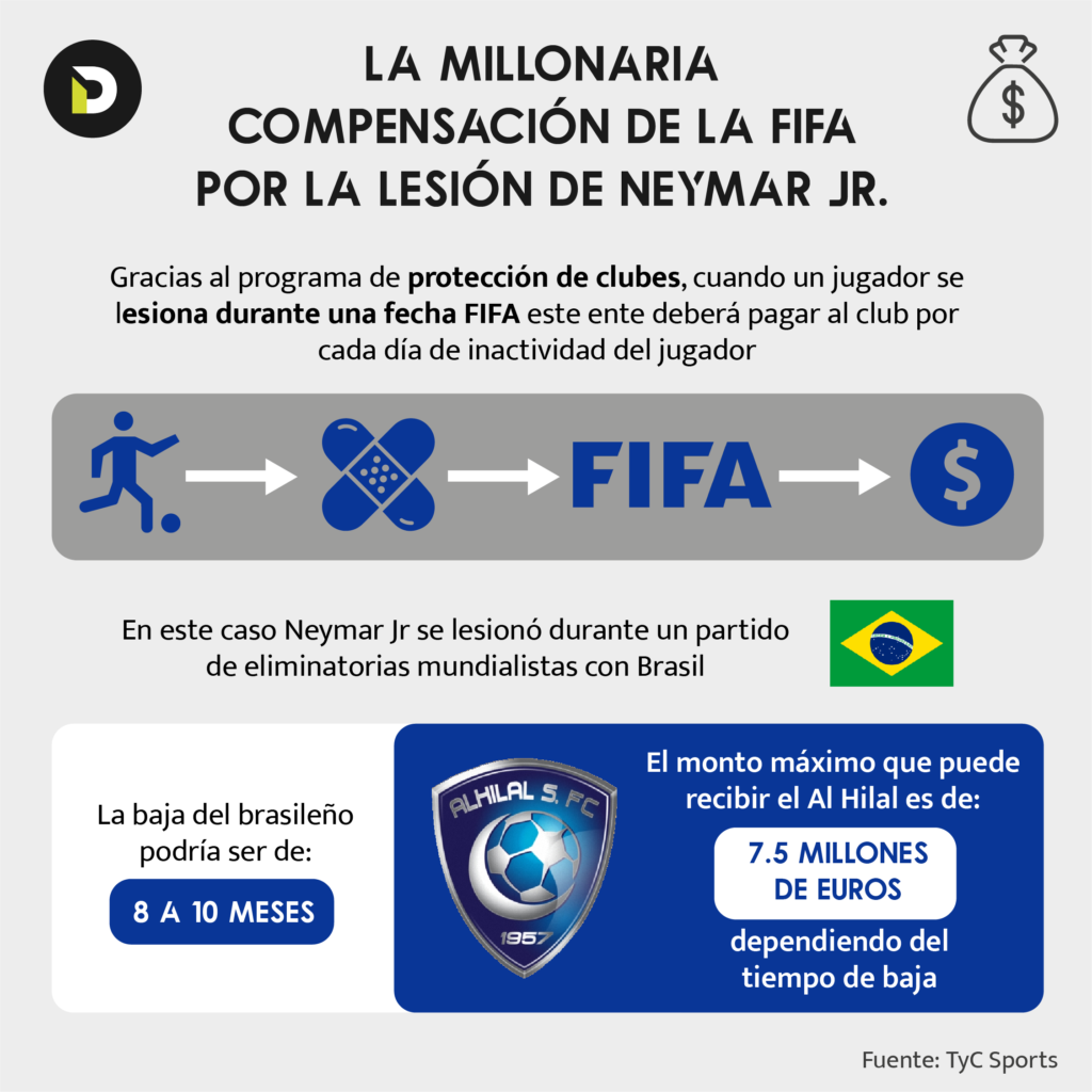 El astro brasileño sufrió una rotura del ligamento cruzado anterior y menisco de su rodilla izquierda. De acuerdo con diversos estudios que se le realizaron, Neymar estará de baja entre seis y ocho meses. Esto significa que la FIFA deberá indemnizar a Al-Hilal por el tiempo de baja del brasileño. Debido al alto salario de Neymar con el Al Hilal es muy probable que la FIFA deba pagar el límite de los 7.5 millones de euros.