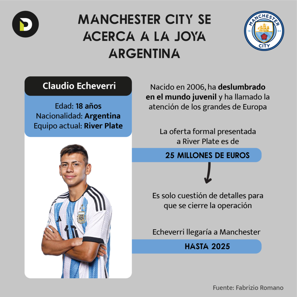 El club inglés desembolsará 14.5 millones de euros inicialmente, más 9 millones adicionales basados en su rendimiento. Echeverri, tras terminar la temporada 2024 en Argentina, afrontará su primer desafío en Europa con el Girona, entidad asociada al Manchester City. Sin embargo, esto puede llegar a cambiar dependiendo de los planes que tengan para el argentino.